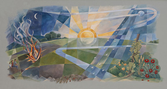 Der Sonnengesang war Ausgangspunkt für erste Überlegungen zum Wandbild. Die dort angesprochenen Elemente und Themenbereiche sind in den Bildmotiven aufgegriffen.