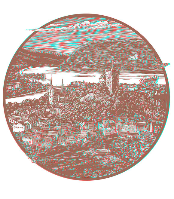 Das unten wiedergegebene Bild (durch Anklicken vergrößerbar) mit Blick auf Bingen erschließt den Bildraum mit einer Rot-Cyan-3D-Brille (rechts rot - links blau).